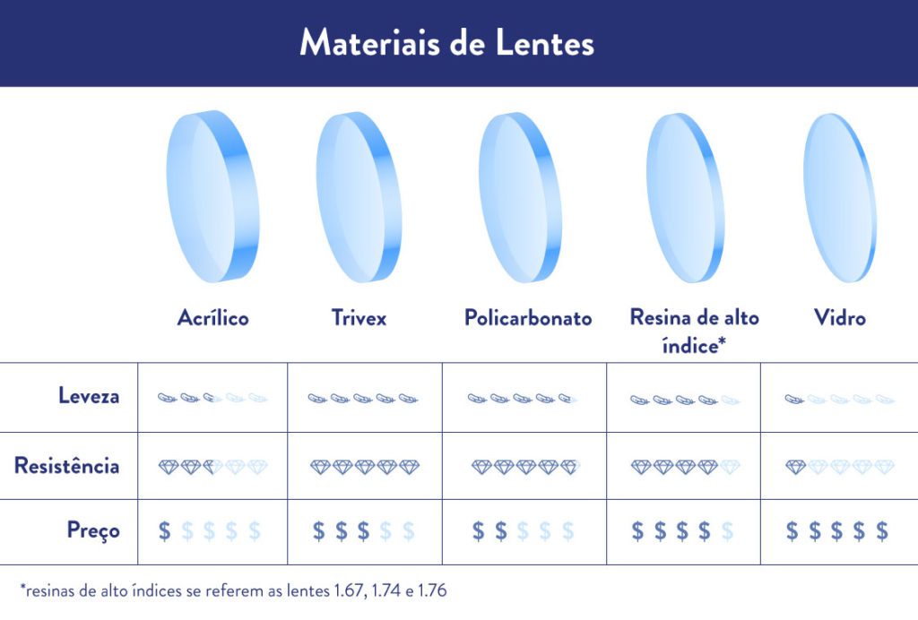 Atualmente existem dois tipos de materiais para lentes de alto índice de refração. Sendo as lentes de cristal, conhecidas como lentes de vidro, e as lentes de resina.